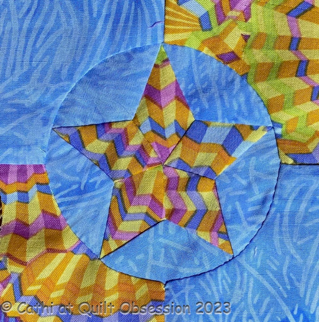 I had a lot of fair-sized scraps of batiks and Kaffe Fassett fabrics left over from making masks. I had always wondered how well KF fabrics would work in small blocks so I decided to test a few out with these wonderful little 5-point stars.