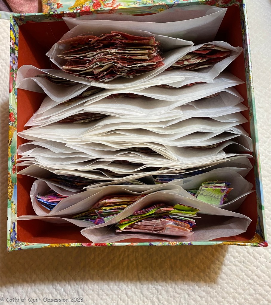 This box is a multi-project box, containing the pieces for the KF/batik 5-point stars, a few more of the shabby chic 5-point stars and the project that’s the reason behind the title of this blog post although the shabby chic stars are likely also a candidate. But for now what is that project?