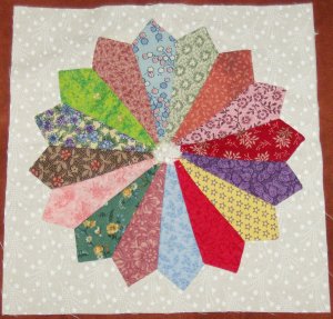 With the applique design printed on the back of my background fabric, I pin a piece of fabric that’s large enough to cover the shape to be appliqued on to the right side of the background, with the right side of the fabric to be appliqued facing up. Then, from the wrong side of the background and following the lines, I baste the pieces on to the background fabric using the large needle and large thread and taking relatively small stitches. Here you can see all the pieces on the quarter block basted down. If you click on the picture to enlarge it, you’ll see the basting stitches quite clearly on the pieces to be appliqued.