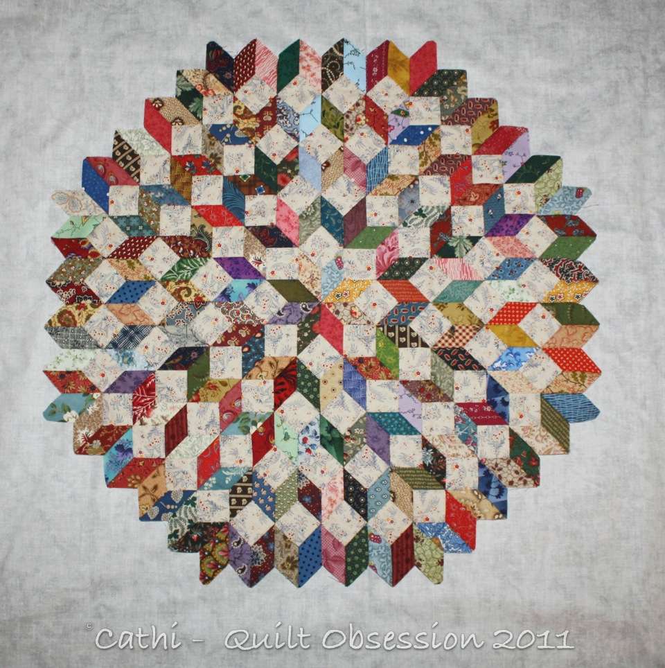 I mixed up everything in this quilt – batiks, checks, plaids, ’30s fabrics, florals, you name it. The only constant was the muslin. Looking back, I can’t believe I traced all those pieces from templates.