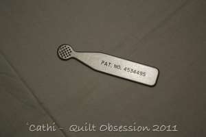 Having a stitching book like this is fabulous. I can lay out my block and then just close the book and, as I used batting for the pages of the book, the pieces will remain there until I open the book up again and begin to stitch. I took two appliqué blocks that I wasn’t going to use in a quilt, layered them with batting and backing, quilted it in a 1″ cross-hatch and then bound it. Then I added pages made from batting.