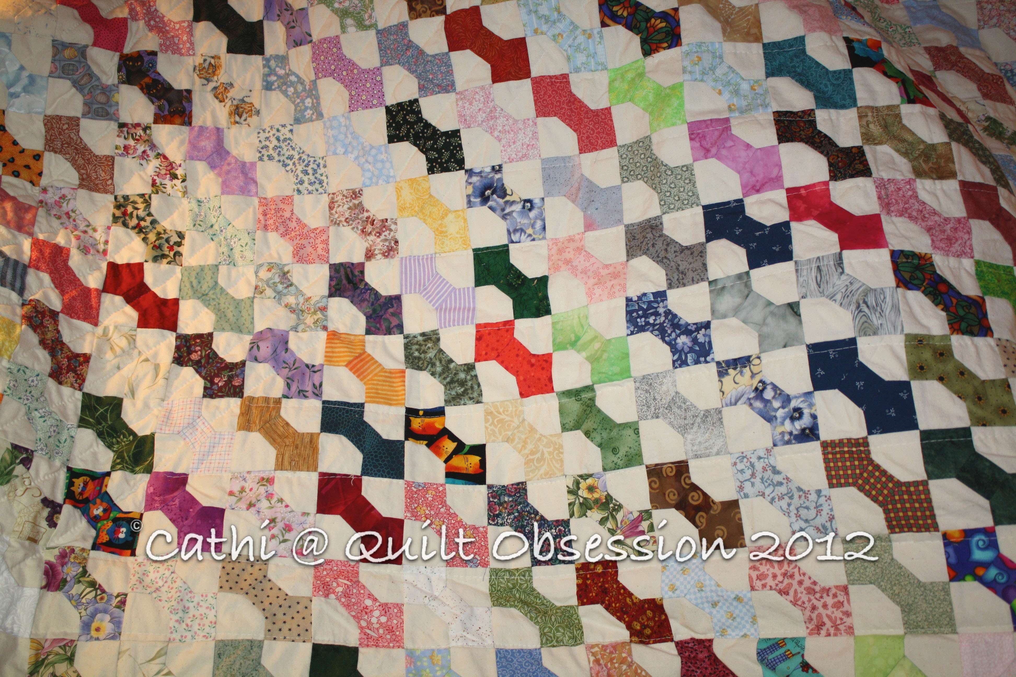 This bow-tie quilt hasn’t been seen for ages. It’s a queen-sized quilt made up of 3″ blocks. I had started to quilt it quite a while ago but ended up putting it away once I realized there was a problem with the basting and that I was going to have to take both my quilting and the basting out, press it as pleats had been basted in and then start over. It has been on my mind the last little while and I finally dragged it out yesterday. While I’m not planning to work on it this weekend, it will be done over the next couple of weeks.