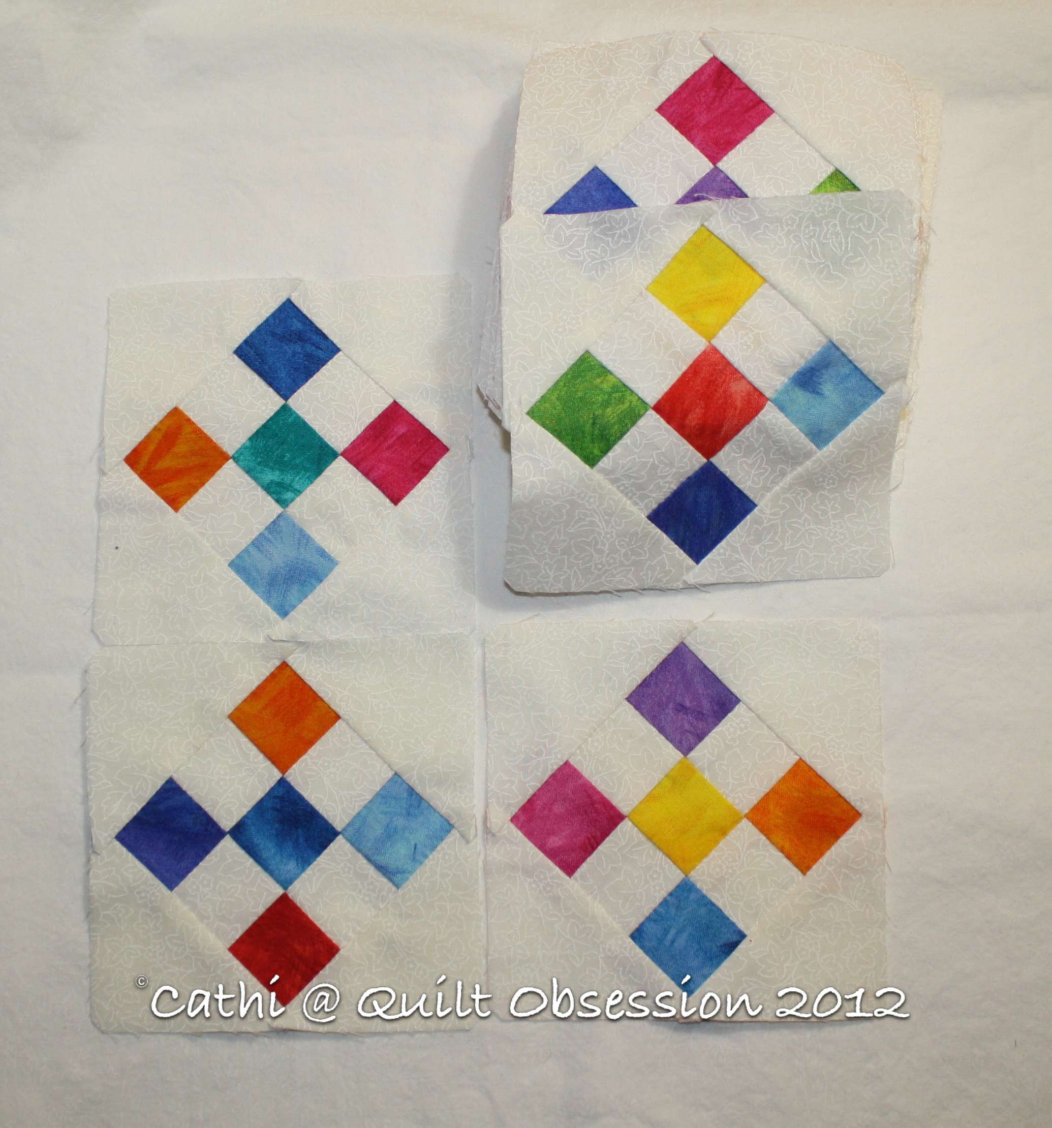 After making the squares in squares on Tuesday, I decided last night to make a few more of the 9-patch blocks set on point. They’re bright and cheerful and just what I needed after a few hours of working on the dreaded tax stuff. And the stack of finished blocks is slowly growing.