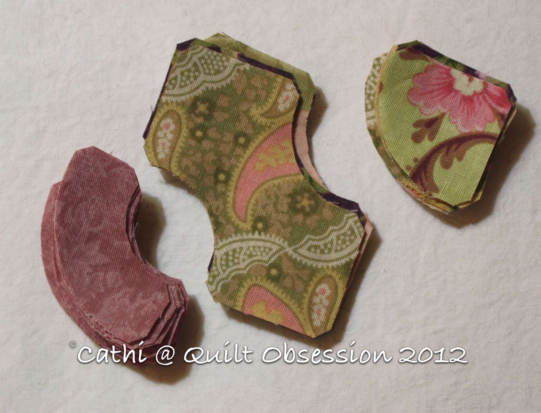 Not much got accomplished yesterday, although these little stacks of the pieces needed for more of the 2″ Drunkard’s Trail blocks are cut out and ready to stitch.