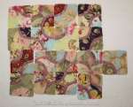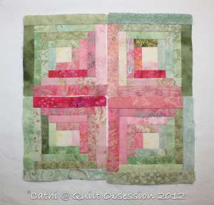 First, the small. Pink and green log cabin blocks that finish at 5″, made with the .50″ Log Cabin collection. There are 12 done and enough printed for another 12 or 16, I think – it’s been so long since I’ve worked on these that I don’t quite remember. Some are hand pieced, some machine pieced. I’m thinking this may be the perfect stitching for out on the roof garden this summer and I’ll get this little quilt finished. This one is destined to be a wall hanging and one I know I’ll love as many of my favourite shabby chic fabrics are in along with some pink and green batiks.