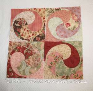 It was inevitable. I had to try out a Yin Yang block in my favourite of fabrics, shabby chic. As I have been asked some questions about how I put these together, I decided to do this little tutorial. The block is composed of four pieces of one identical shape. All the photos can be enlarged by clicking on them.