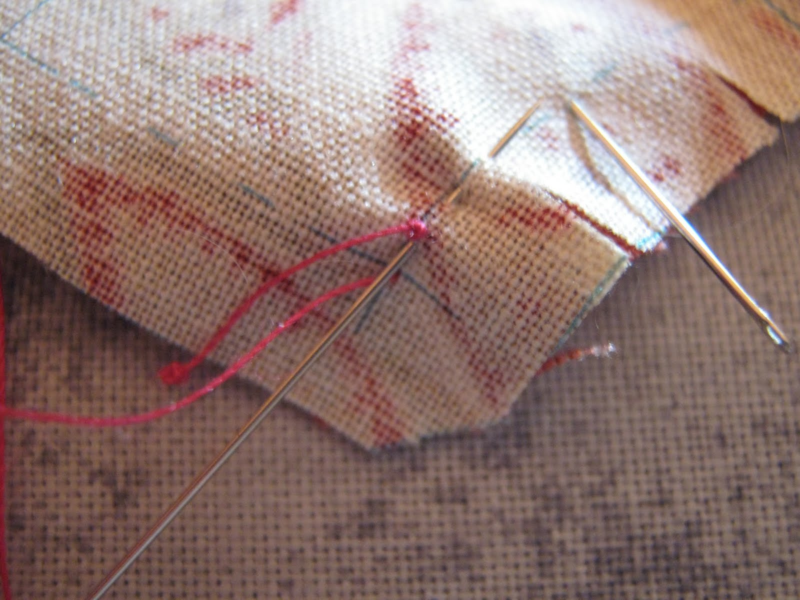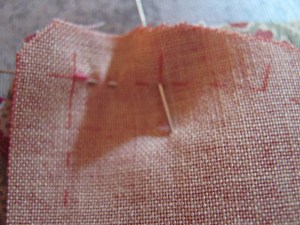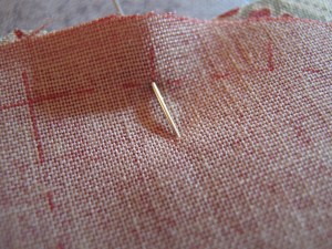 Then just pull the needle through, take a back stitch, move the pin/needle to the next matching point and continue on. When moving the pin/needle, I always check that it is right through the matching point on the back as well as the front.