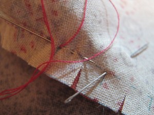 When I begin a row like this, I use 3 of the #12 sharps — one to pin the beginning of the seam, one to pin at the first matching point and a third needle to thread and use to stitch. Here I’ve pinned the matching point at the beginning of the seam and the first matching point after that.