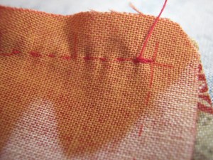 I take the last stitch in that seam, then a back stitch and then I take the needle through again to the back of the fabric as there’s no need to knot the thread when starting to add the next piece.