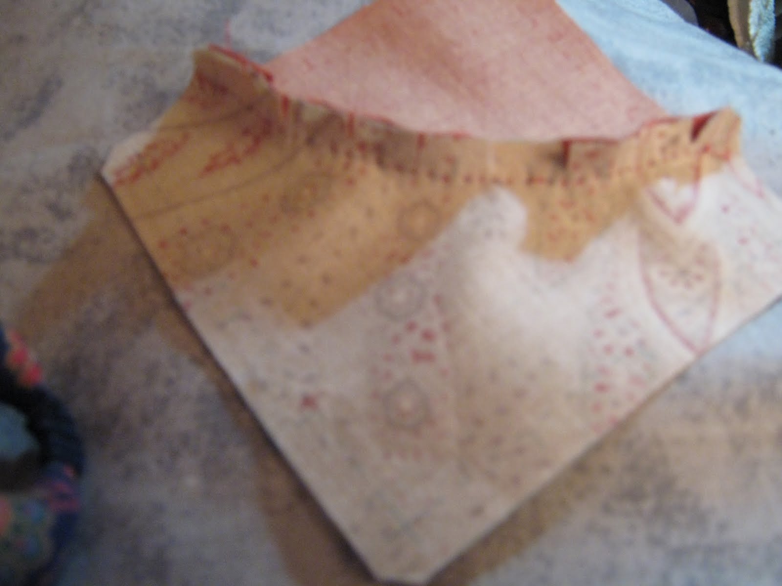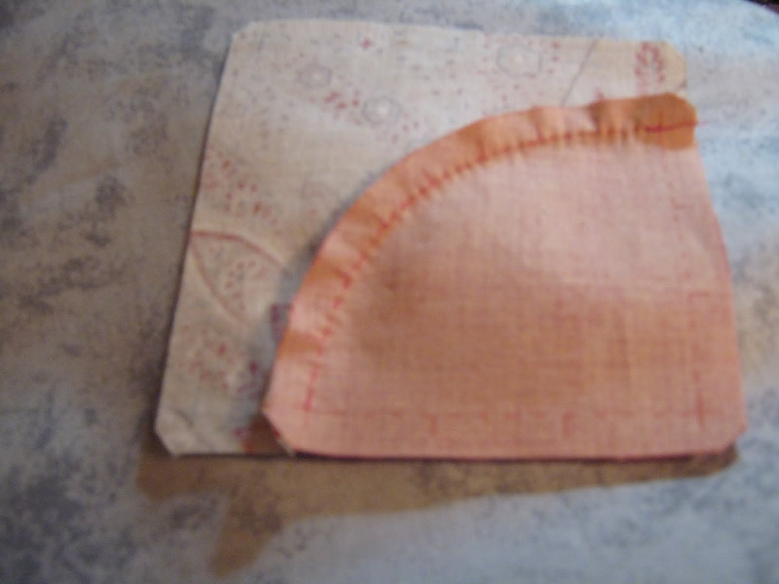 I choose my next printed piece, clip the concave seam allowance and line it up with the other half of the convex curve on the first batik piece and insert the pin/needle at the first matching point.