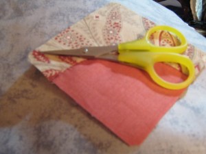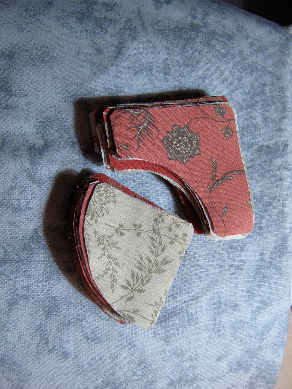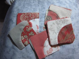 First I chose the fabrics for the first and second rows of this small clamshell project. In this case, I’m using the soft blue/grey batik in the first row and various prints for the second row. To begin piecing, it’s simply a matter of matching the concave curve on the second row piece to the right half of the convex curve on the first piece of the second row.