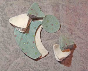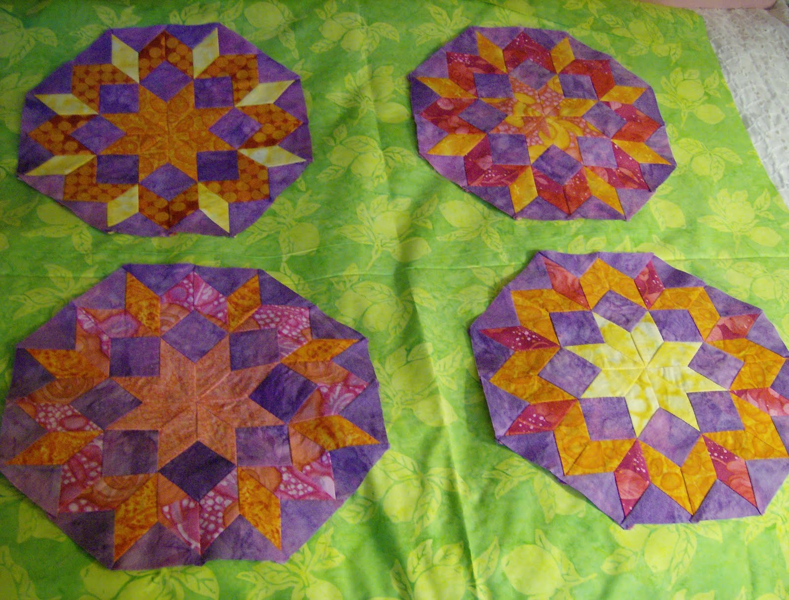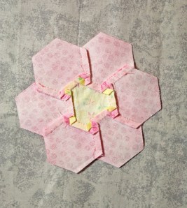 It felt like spring on Monday. So I decided to make a few of hexagon flowers in the spring colours. As I stitch using hexagons that have been printed with Inklingo templates right on to the back of the fabric, I can put together 4 of these flowers in about 2 hours. No basting, no whip stitching. Just a plain running stitch and lots of continuous stitching when it comes to joining the outer ring to the centres. These are made using 1″ hexagons.