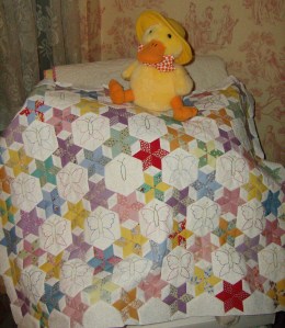 Thursday night I got out the completed blocks for the Harpsichord Quilt. I have a long way to go, but was pleasantly surprised when I realized I already had 2 of the vertical rows complete. The centres of the last three pink and cream big stars are done. If the weekend weather is as rainy and cold as they’re predicting, I think I may have at least 2 of the stars completed by Monday. Now I’m seeing the benefit of a large block as I may well have this top together by month end.