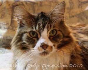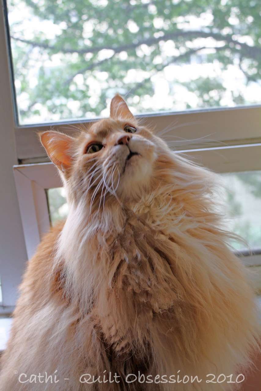 Smudge was chasing leaves on the windowsill for a while on Thursday morning and then peeked out from under the lace. We couldn’t resist this photo, even though it is a bit blurry.