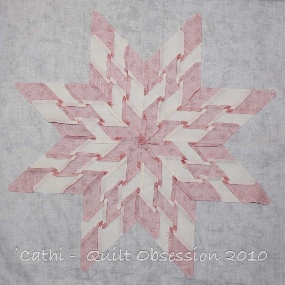 An inelegant name for this quilt but so far that’s the best I can come up with. This block measures 18″ tip to tip. At the moment, I’m thinking about using only this pink fabric and the cream and making a total of 9 of these stars. That would give me a 54″ square centre and then I think I’d do something with a border that included some smaller stars. That’s a very preliminary plan. Putting the star together was fun as there were tons and tons of opportunities for continuous stitching.