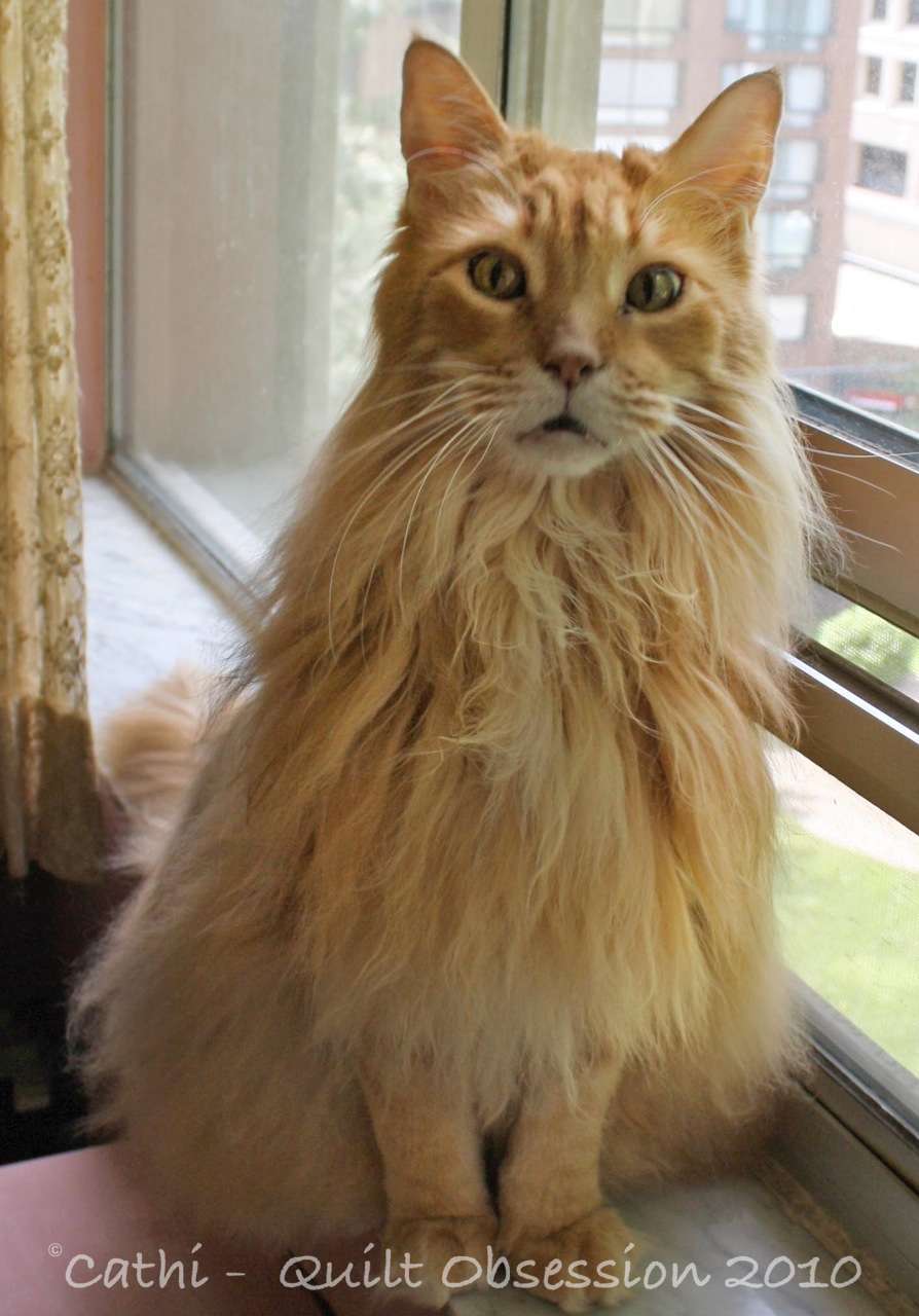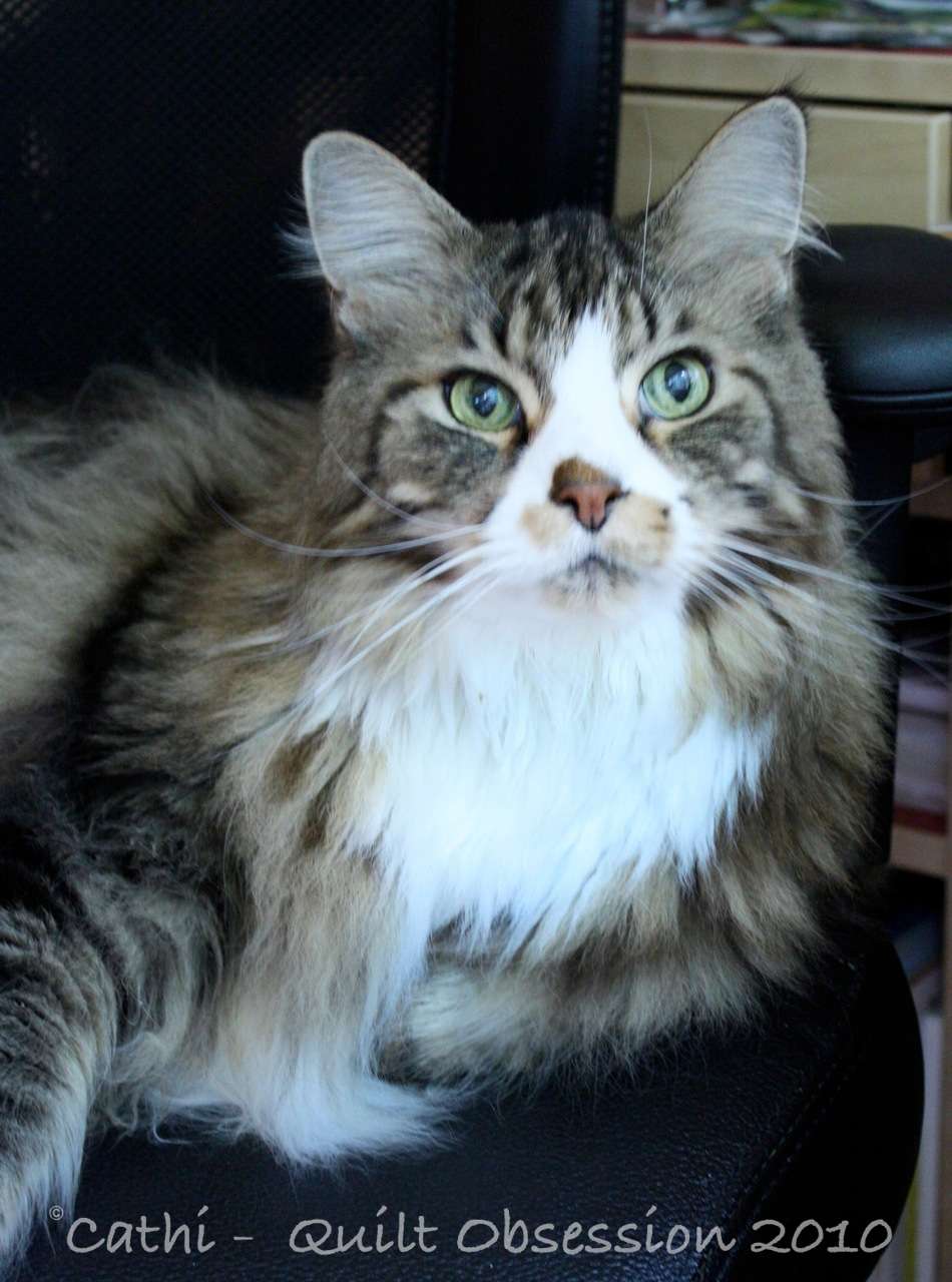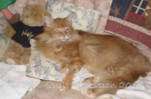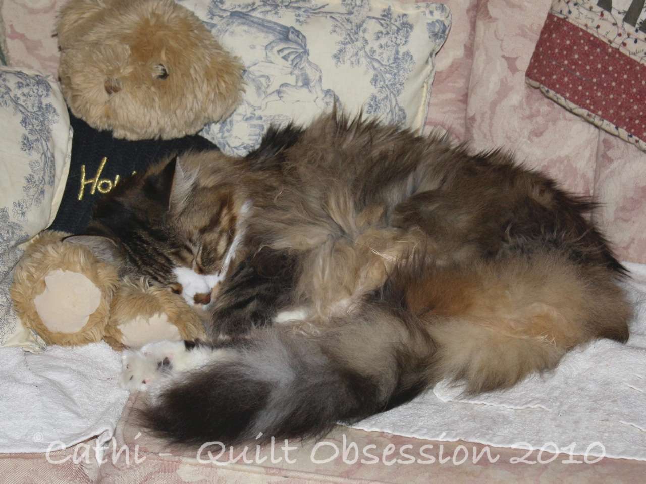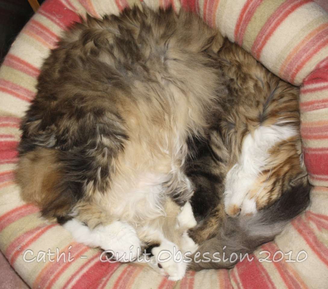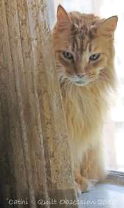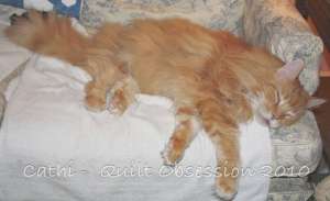 On the weekend, I got a lot of the cream hexagons for the POTC blocks stitched. At this point, I only need to stitch together the ones needed for two more blocks and that part will be done. So I feel like progress is being made. We were taking trying to take a picture of a finished POTC block when Smudge decided he needed to help. You can just see a bit of the block that he’s lying on.