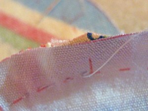 I take the last stitch in that seam, then a back stitch and then I take the needle through again to the back of the fabric as there’s no need to knot the thread when starting to add the next piece.