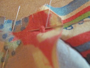 Then just pull the needle through, take a back stitch, move the pin/needle to the next matching point and continue on. When moving the pin/needle, I always check that it is right through the matching point on the back as well as the front.