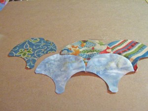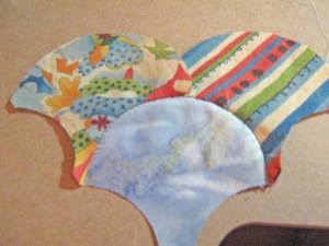 First I chose the fabrics for the first and second rows of this small clamshell project. In this case, I’m using the soft blue/grey batik in the first row and various prints for the second row. To begin piecing, it’s simply a matter of matching the concave curve on the second row piece to the right half of the convex curve on the first piece of the second row.