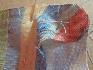 When I begin a row like this, I use 3 of the #12 sharps — one to pin the beginning of the seam, one to pin at the first matching point and a third needle to thread and use to stitch. Here I’ve pinned the matching point at the beginning of the seam and the first matching point after that.