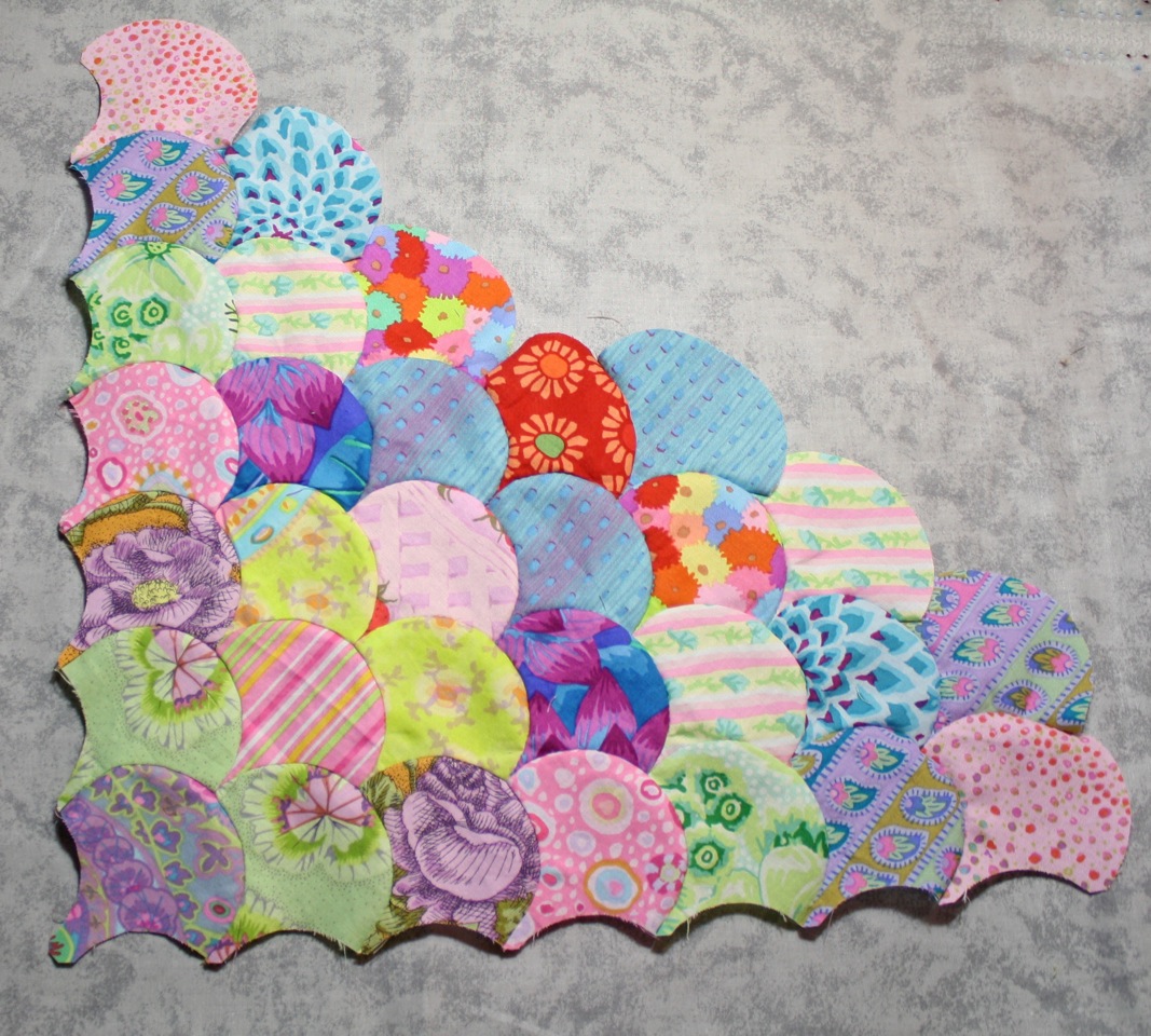 For this little quilt, my third row is all batik clamshells again and I’m clipping the concave curve of the batik pieces and stitching them to the convex curves on the print clamshells in the second row. There are lots of opportunities for continuous stitching, which I take advantage of. To ensure there are no little holes where pieces join, I always circle the intersection at the joins. It takes seconds to do and, once you get into the habit of doing that, it becomes second nature.