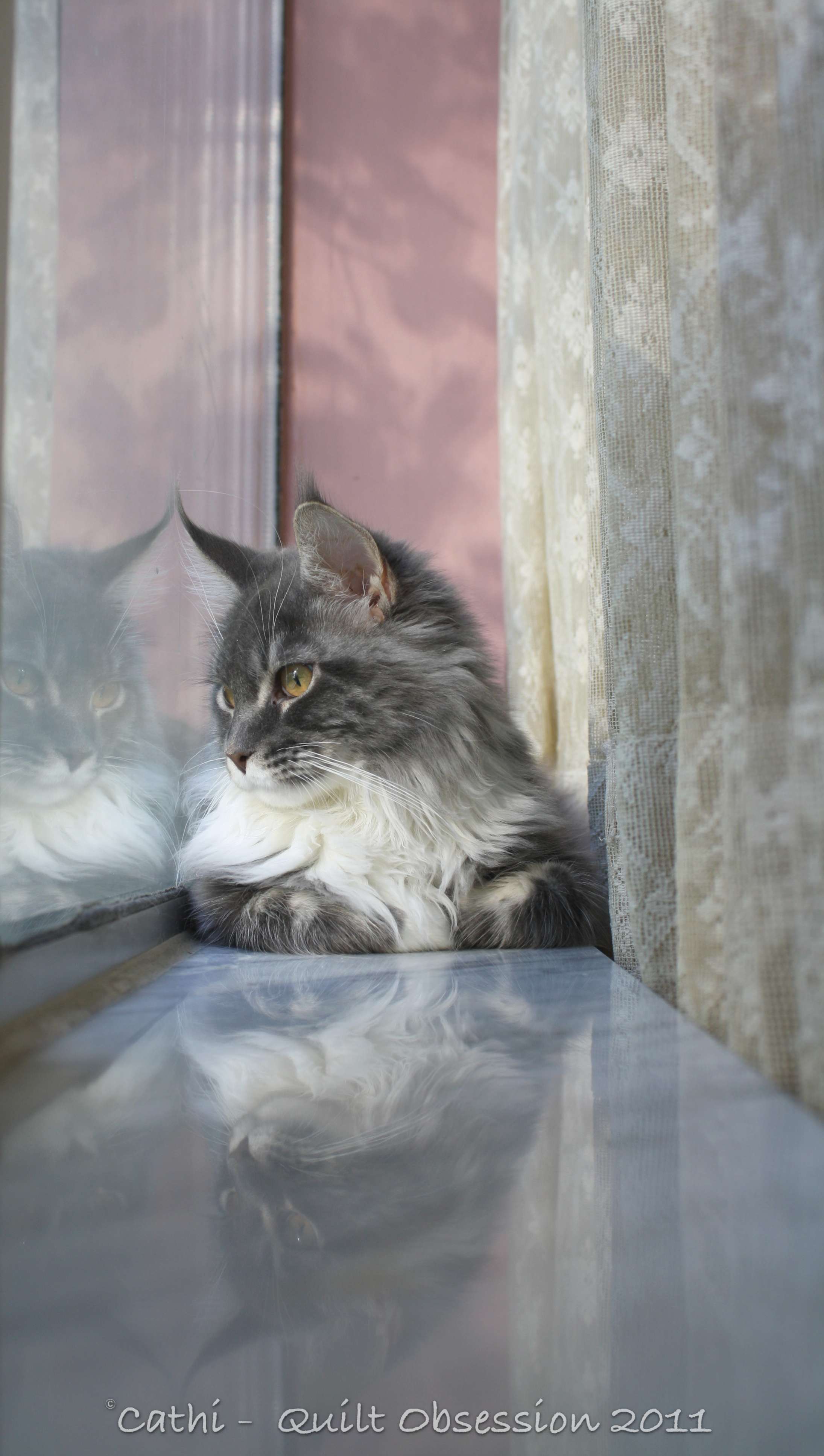 Putting the binding on was fun. It was lovely and warm and was a true cat magnet. Baxter landed on my lap almost the minute I started tacking the binding down and stayed put for much longer than he usually does. Clearly a little flannel quilt is a must just for him.