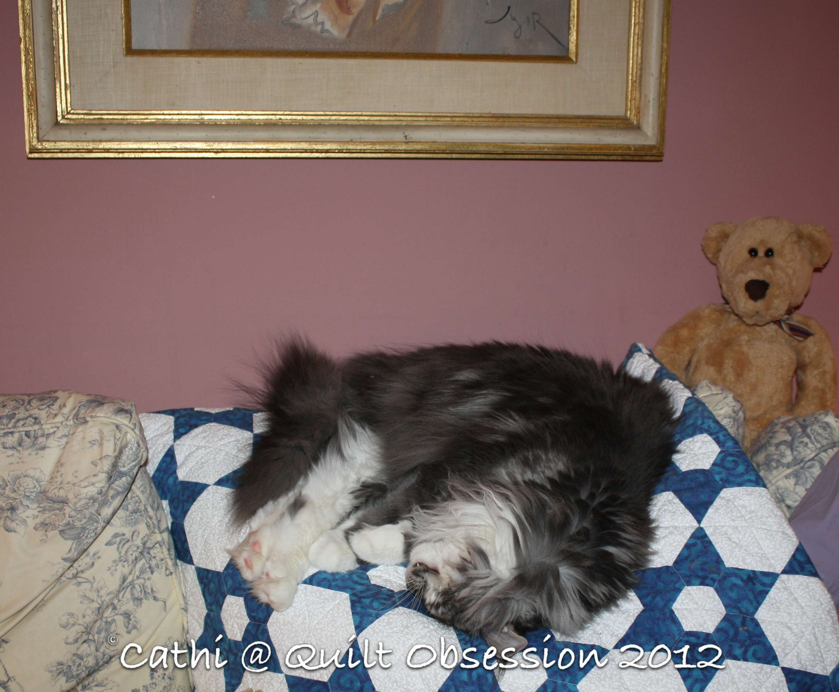 While I was flying from the iron to the printer to print the shapes, I glanced over at the couch and noticed Baxter sound asleep like this. I think this may be one of Baxter’s first almost headless cat poses. Mr. Q.O. captioned it, “The Amazing Clingo!” How he stayed up like that is beyond me. Guess the quilt has magical holding powers on kitties.