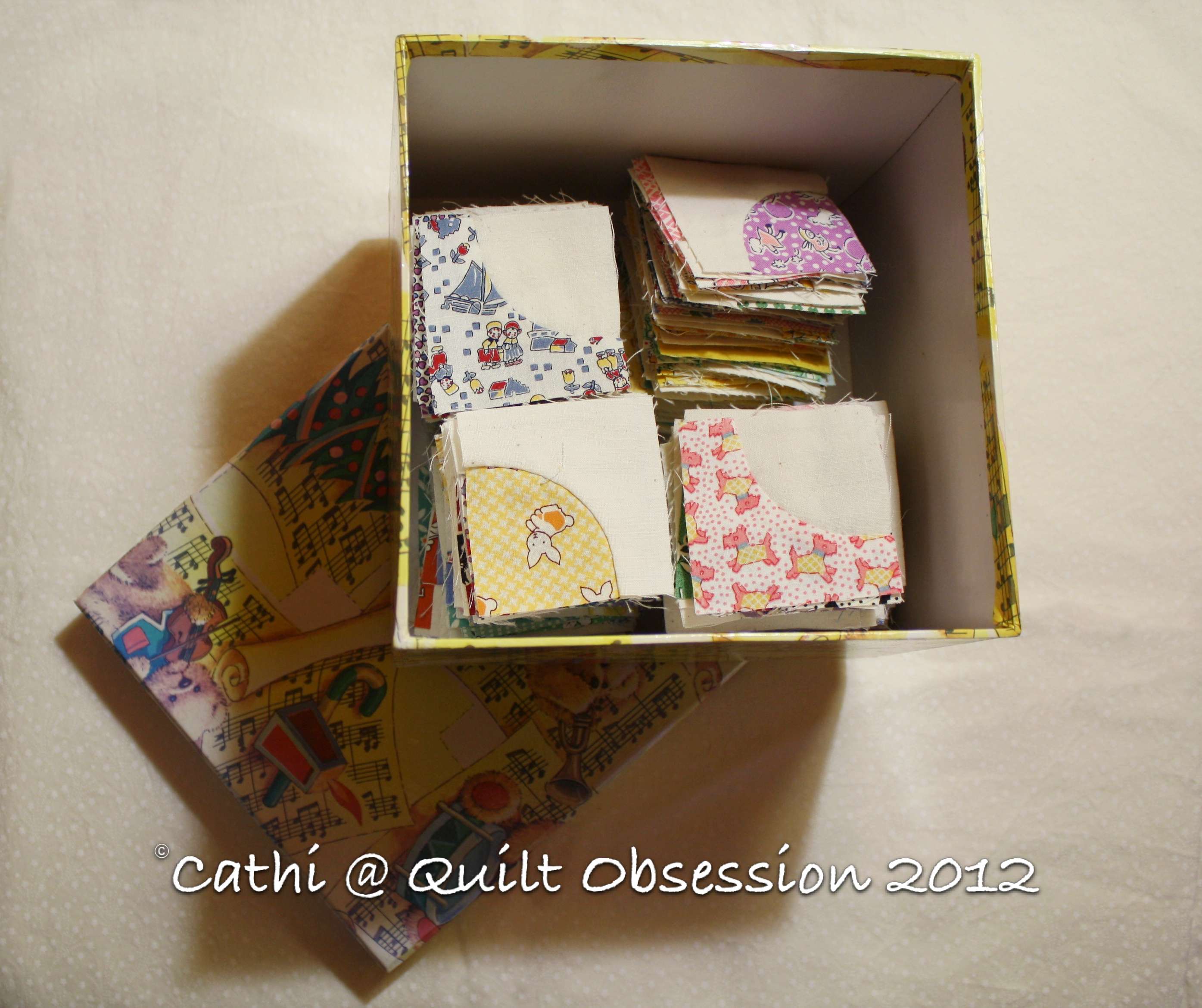 I made my freezer paper templates and traced them on to ’30s fabrics and muslin and pieced those little blocks for a couple of months. But slowly the tracing of the templates became less and less appealing and harder on my hands. And so into this box the completed little blocks went. And, until last night, the box wasn’t opened again for a number of years.