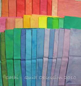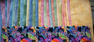 These hand-dyed fabrics have been in my stash for ages. I cut each one of them in half, gave half to a friend, kept half for myself and we’re both going to work on a quilt using just them and perhaps one other fabric as a neutral. I’ve wanted to make something special with these for ages and am hoping that having this challenge will be just the thing I need to come up with the right design to showcase them. The hard part of this for me will be that it has to be a machine-pieced design. The fabrics are gorgeous but they’re very tightly woven, even more so than a batik, so I know that hand piecing would be too much for my hands. I’ve been pouring over some of the encyclopedia of blocks books and think this may be what finally gets me to absolutely force myself through EQ and play with some design ideas that way.