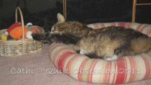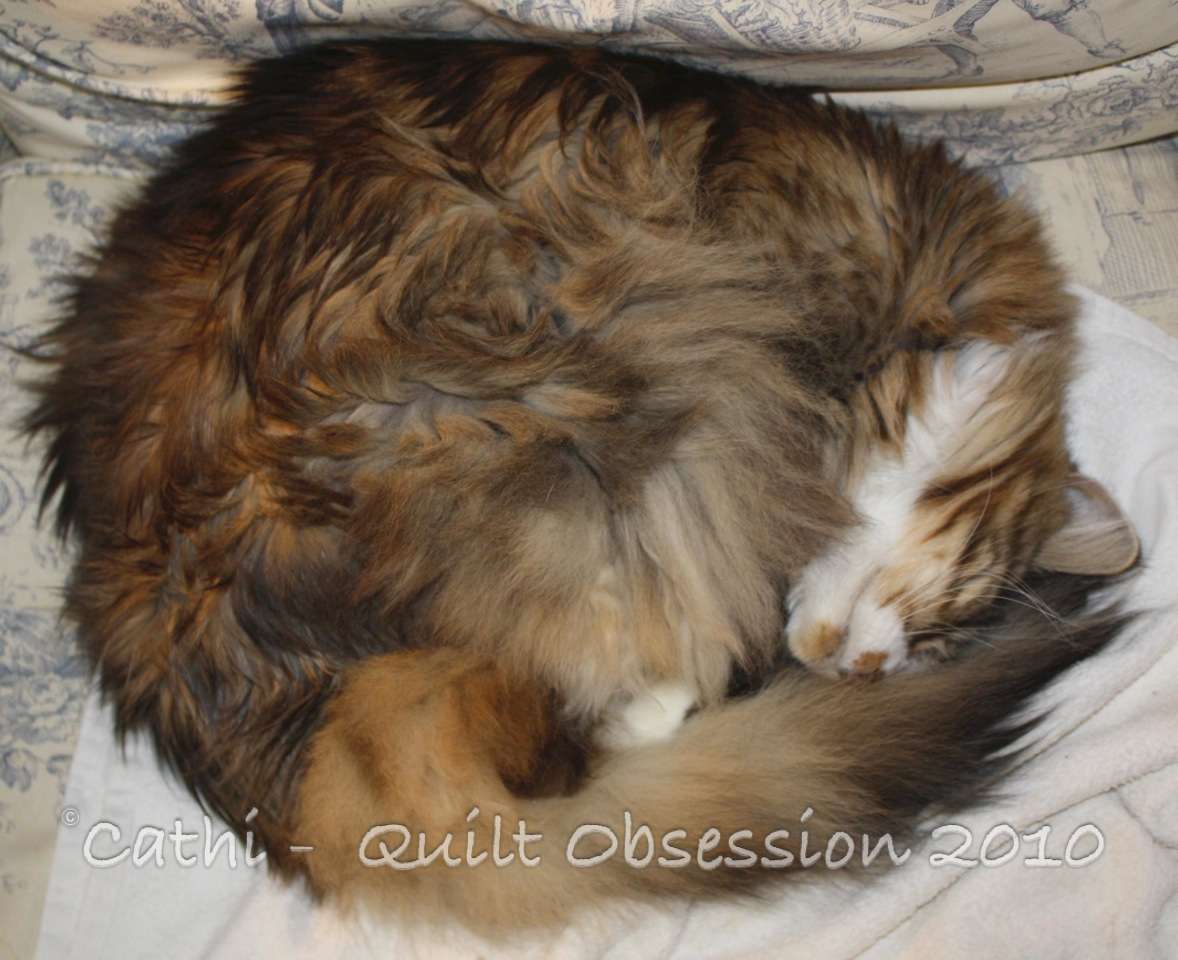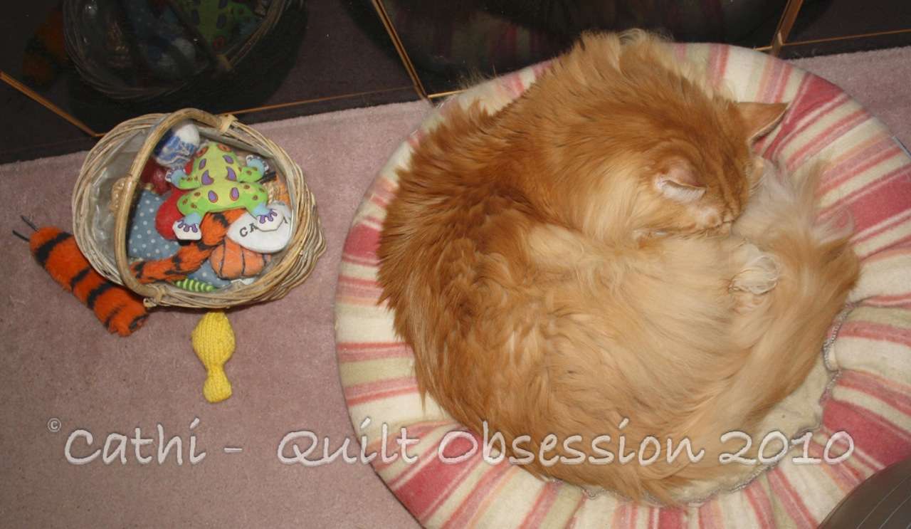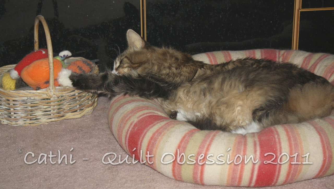 The cats are showing how well they can curl up into kitty circles. Lester in a kitty bed: