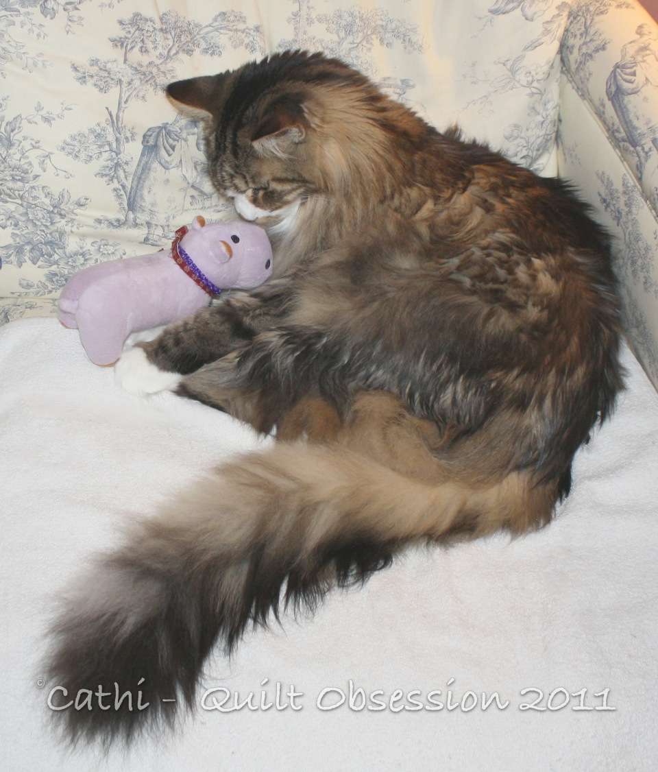 Smudge has been playing with his favourite kitty toy, Cappy, a fair bit the past few days. Wednesday night he was holding on to it while he had a snooze.