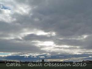 Friday we had temperatures in the 90s. Saturday? Saturday it was maybe in the low 60s but very breezy and it felt unbelievably chilly after that heat the day before. The sky on Saturday looked so stormy, although we had nothing but a few sprinkles of rain. We got this shot just down the street from Sew Sisters.