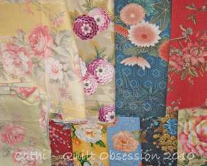 On Saturday we went up to Sew Sisters as I wanted to look for more florals for the Pickled Ladies blocks. I found these and then, on Sunday, went through the final container of shabby chic fabrics here and found another great grouping. So now I think I’m getting close to the halfway mark with florals for the clamshells. I’m thinking of adding some Oriental florals into the mix as there are some that play quite nicely with the shabby chic.
