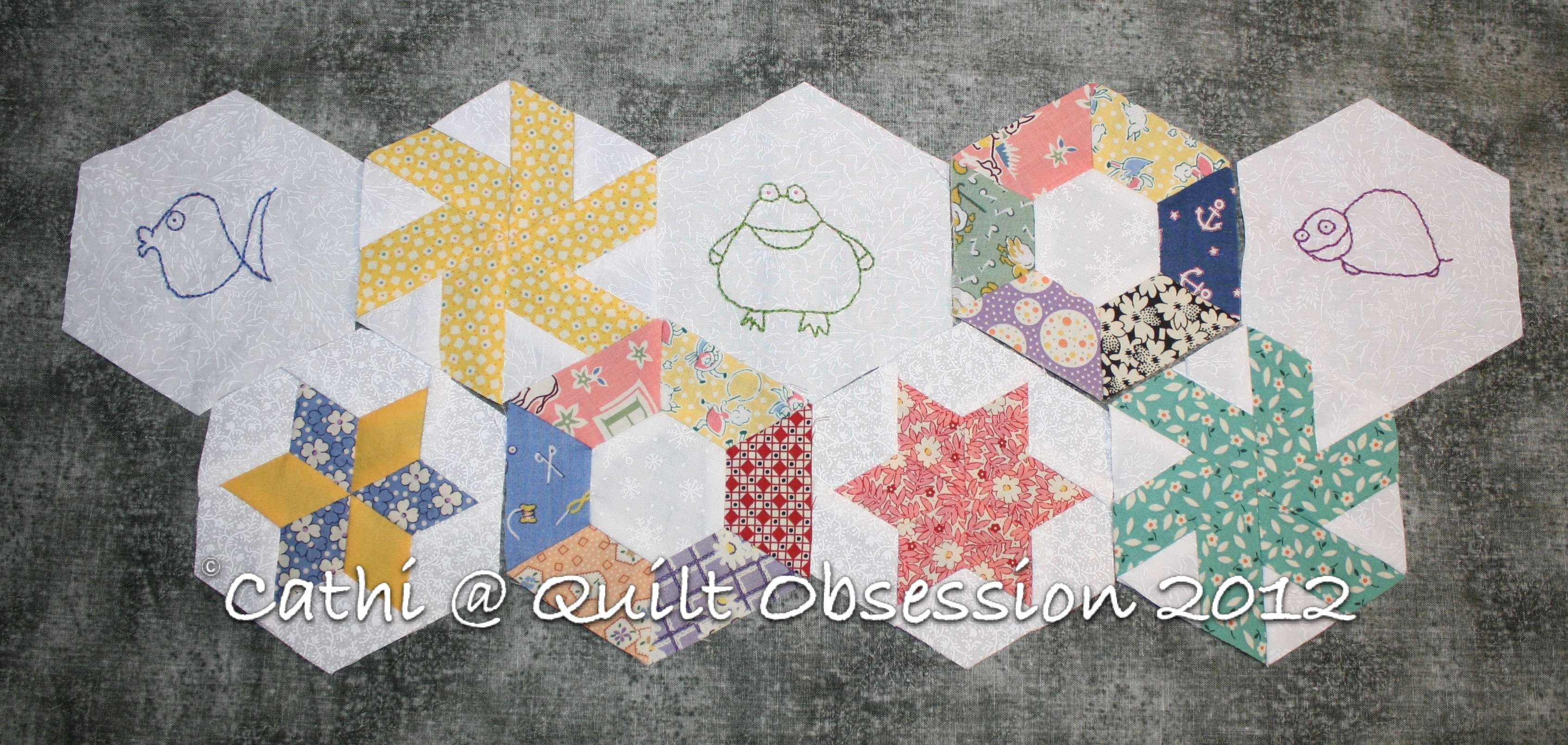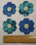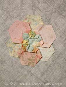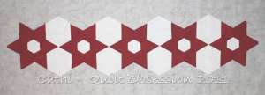 This is an enormous block for me – 18″ from side to side and about 21″ from point to point. I’m going to make two of them and then turn them into — well, I don’t know yet. I might just add setting pieces to turn them into large rectangles and use them as the covers of a stitching book. It’s made with the Inklingo 18″ Rose Star collection. I used the 3″ hexagons and one-third of the 3″ hexagons from the 3″ Hexagon collection for some of the shapes as well as the kites in the Rose Star collection. I fussy cut the large centre hexagon. Had I used all kites, I could have had an entirely different effect.