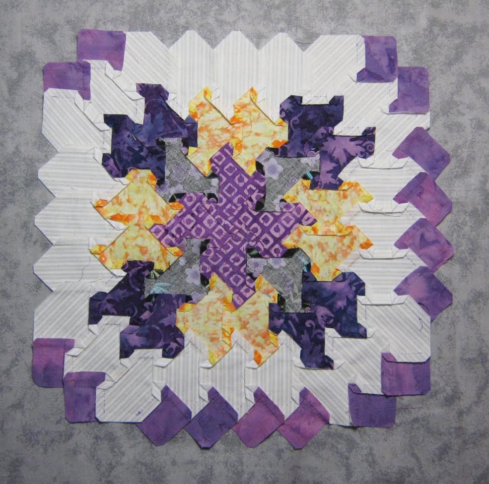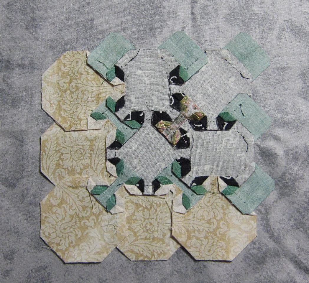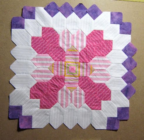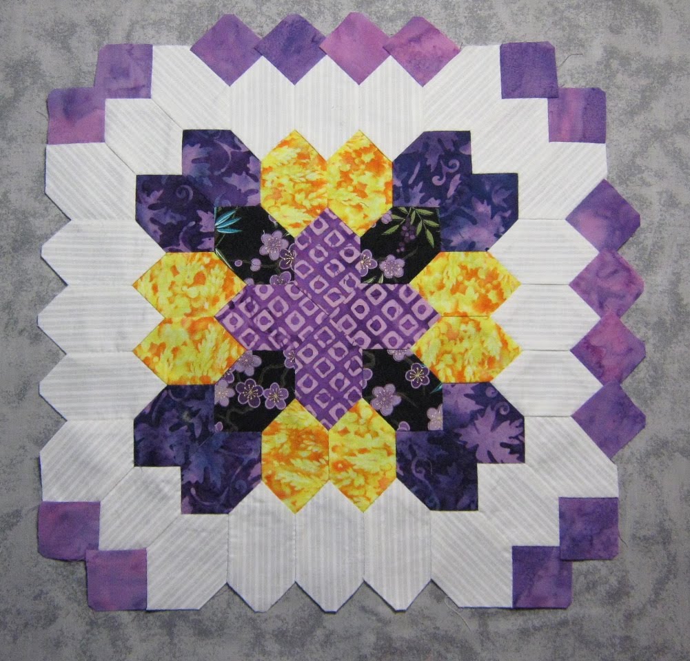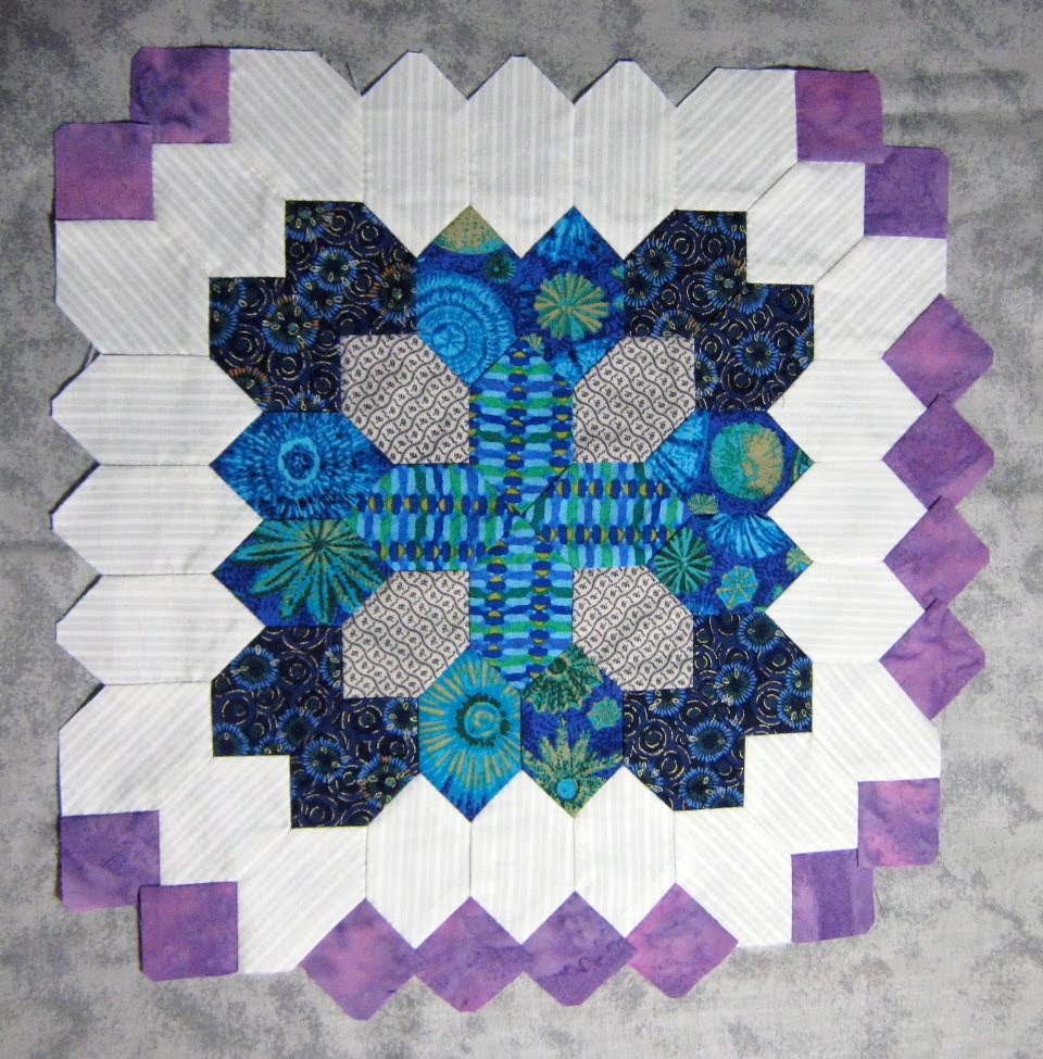 The very first POTC block I made and what is probably my favourite block was up next for framing with the cream hexagons and squares. The camera had trouble with the one of the purples in the block. The long hexagons that appear to be a blue purple are much more purple than they appear.