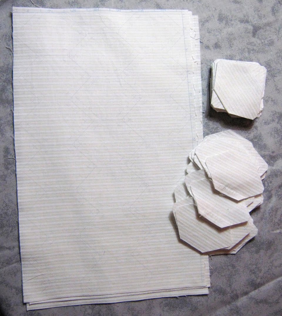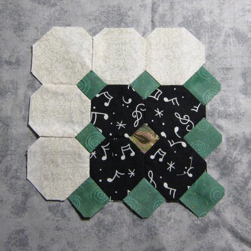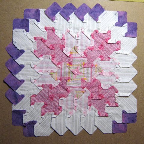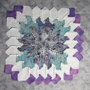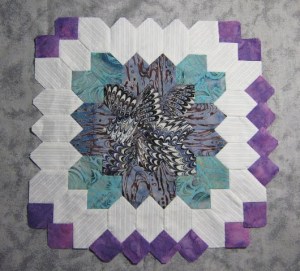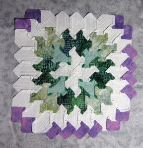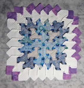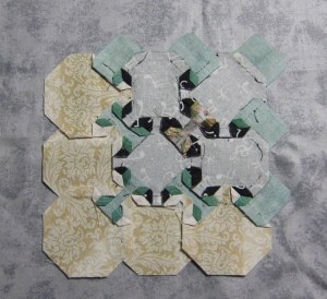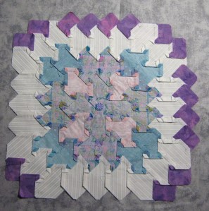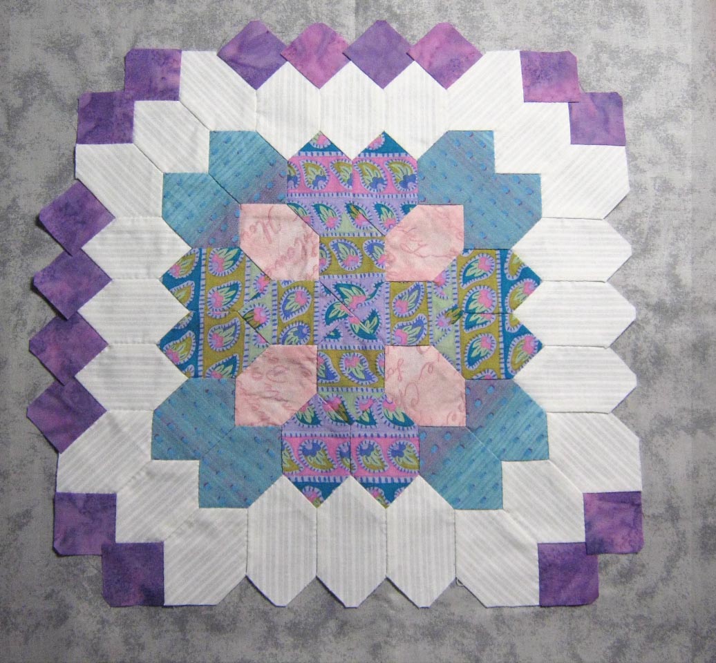 The very first POTC block I made and what is probably my favourite block was up next for framing with the cream hexagons and squares. The camera had trouble with the one of the purples in the block. The long hexagons that appear to be a blue purple are much more purple than they appear.