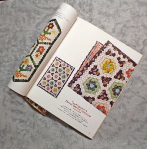 I’ve been looking through the Japanese hexagon book again and, among other quilts that catch my eye, this one really interests me because of the quilting design used in the flowers. It’s very pretty and very effective. I think if you click on the picture to enlarge it, you’ll be able to see it.