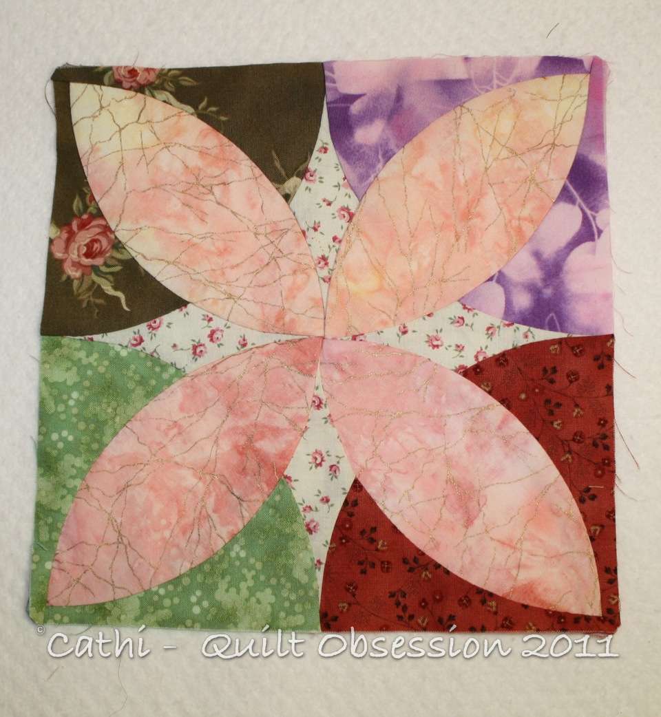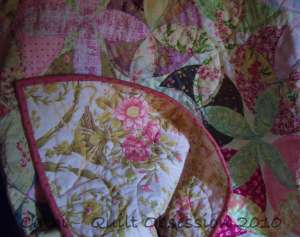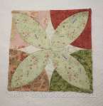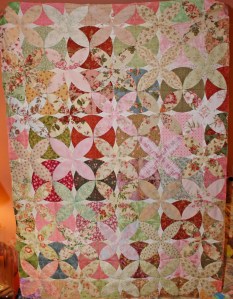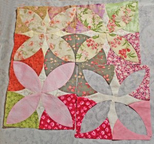 Watching the circle appear as I joined the fourth block to the first three made me smile. Now there’s no stopping me on this. I love the look I’m getting with all these shabby chic fabrics. Sort of like an old chintz print in an English cottage somewhere, I think. Mr. Q.O. keeps looking at it and saying it looks old. Just the look I’m after!
