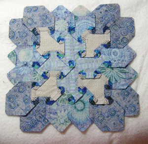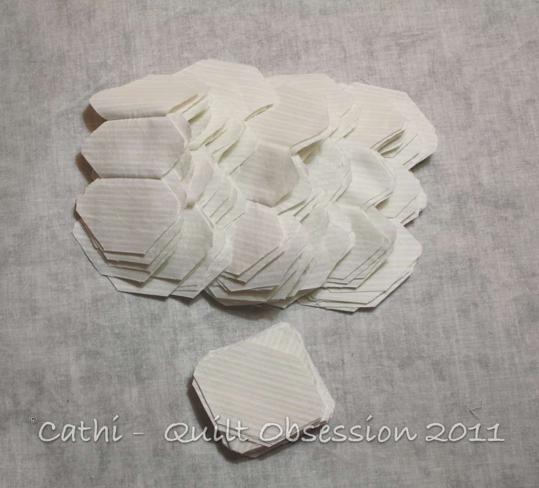 It took a while, but the cream hexagon frames for the POTC blocks are all ready to be attached to the 10 blocks that are not yet finished. A little more printing of the setting pieces and I’ll have everything I need for the outer edges of the quilt top ready as well.