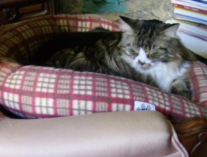 Yesterday we were doing some tidying up/cleaning up and, as part of that, had taken the kitty beds up off the floor for a moment. Smudge, being not the most patient kitty in the world, decided he wanted to curl up in his kitty bed then and there. He didn’t care if it was perched in a chair. He almost instantly went to sleep. Of course, we left him and the kitty bed there until he woke up.