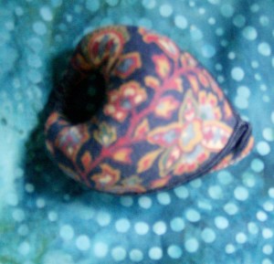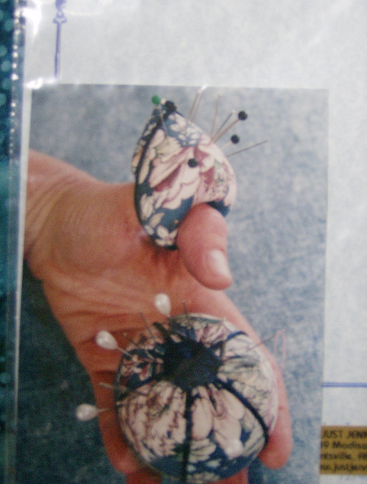 Last year, the friend in Texas had sent me this fabulous thumb pincushion which I would now be lost without. I don’t use it on my thumb, though — for hand piecing it seems to be perfect on my index finger. I had used the bottle cap type finger pincushions before I got this but this is far superior.