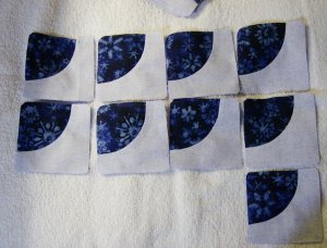… is what I’m making for a blog swap. Although you can’t really tell in this photo (and why is the camera having so much trouble with this batik??), the dark blue batik has snowflakes on it. I’ve only laid out 2 rows of 4 here but the little quilt will have 5 rows of 5. Now I’m trying to decide whether I should have sashing between the window panes. I’ll probably audition some medium blues for that. I’m thinking I’ll add a little glitter to the “snow” on the window edges by adding some crystal beads.