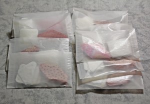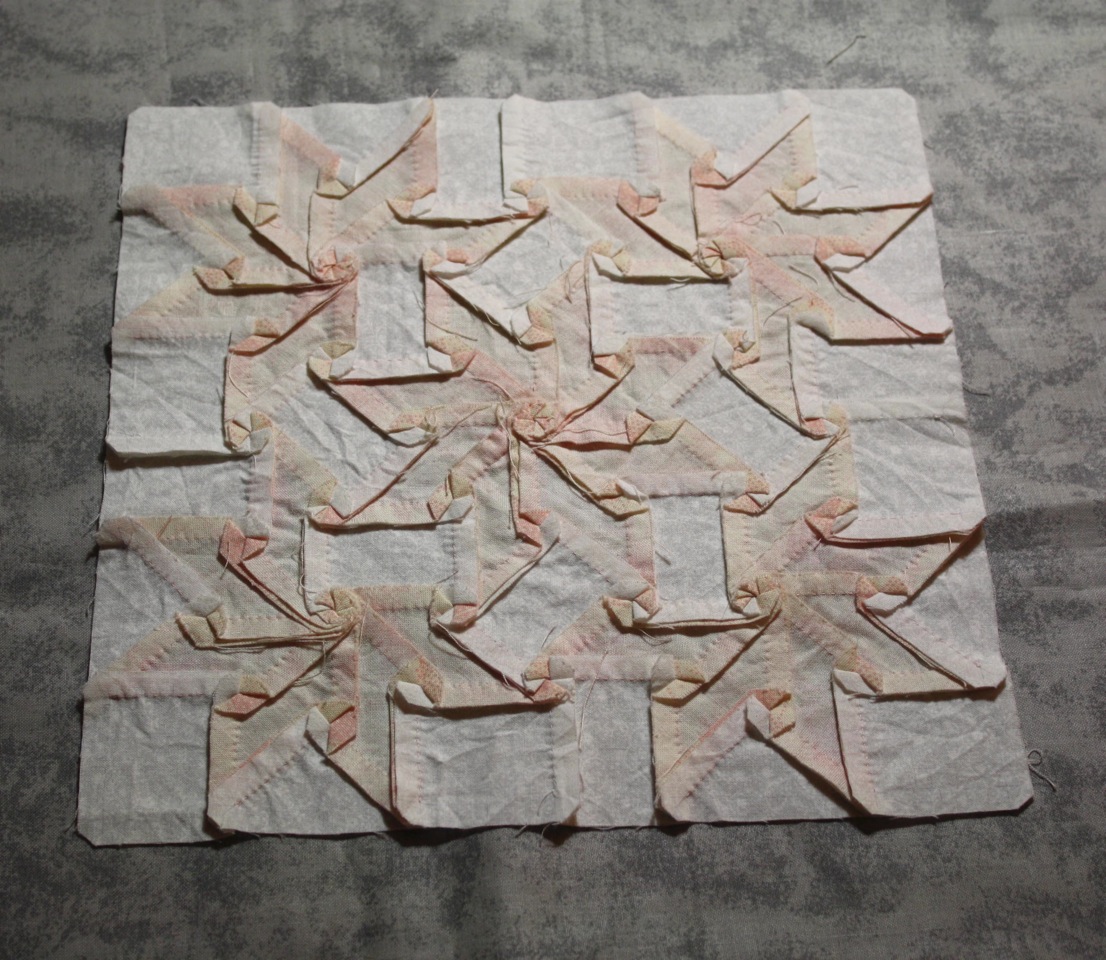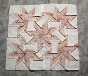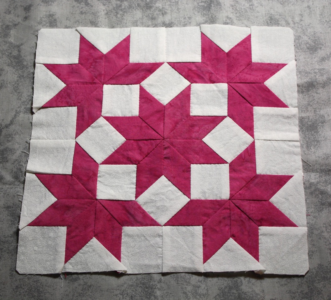 I think I’ve decided on how I’ll set these Pink Ice blocks — on point with perhaps 9-patch blocks. The back of block 26, so far: