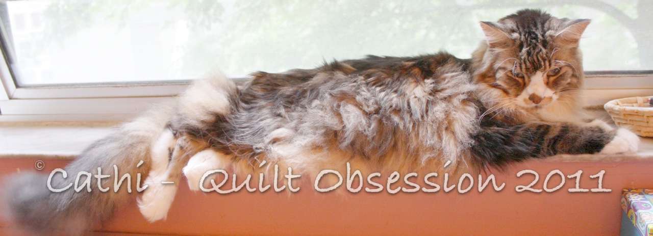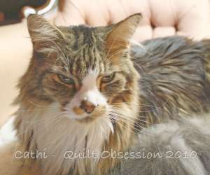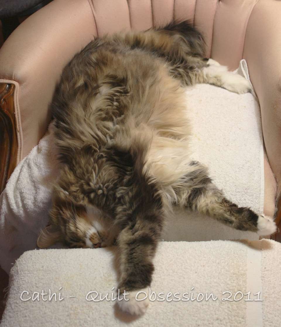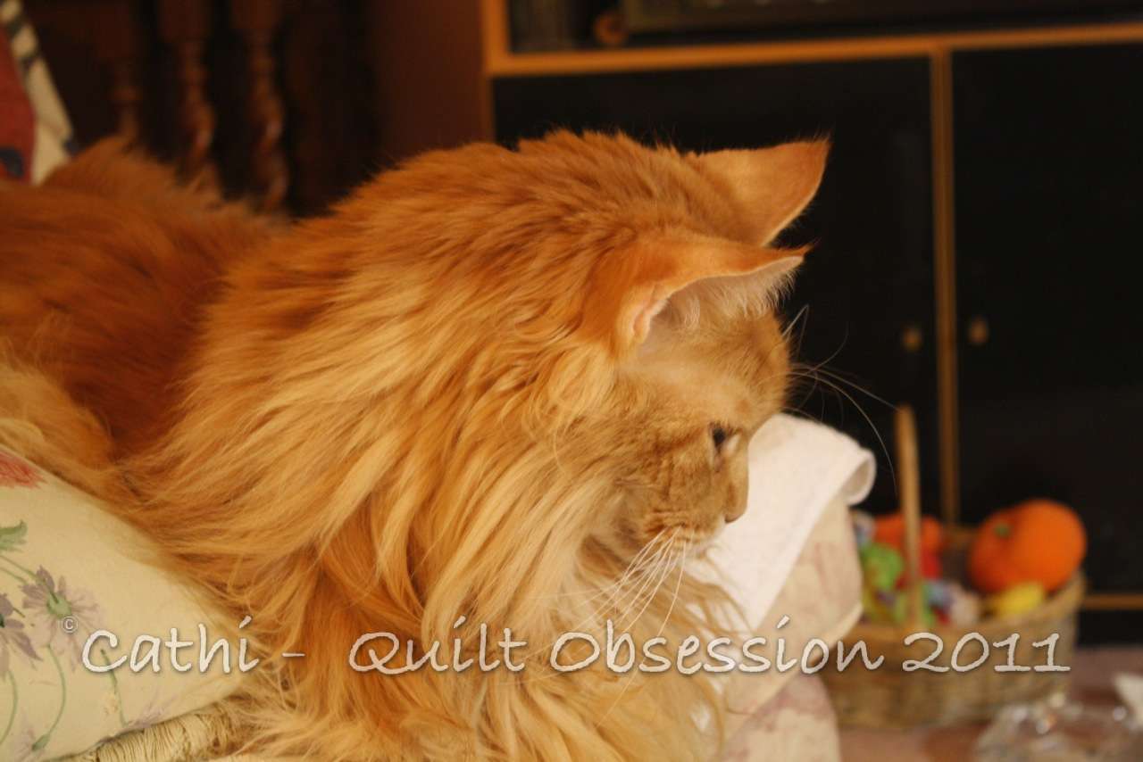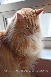 Smudge was watching as I was laying out fabric pieces, although you can’t really tell that from this picture. I kept waiting for him to decide to “help”, but he was interested in only watching this time. I’m not altogether sure what the look on his face is saying — whether he was approving, bored or giving me one of those impossible to fathom kitty looks.