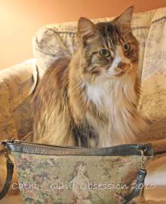We were about to go out somewhere on the weekend, and I had left my purse on the couch for a minute. I think this look says Smudge was hoping we were off to the pet store for kitty food and toys.