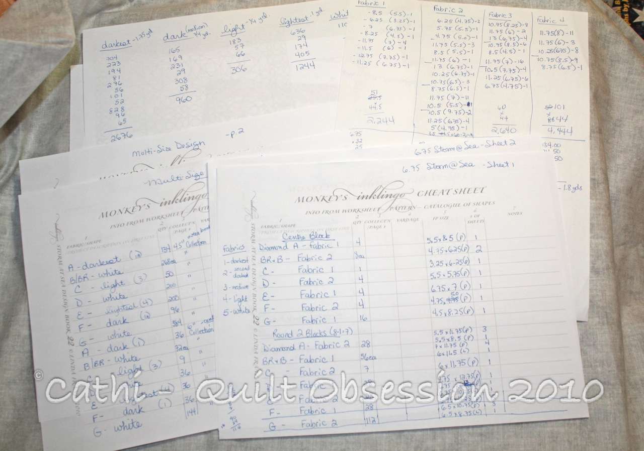 When I finally realized that neither idea would work with the initial 4 fabrics alone, I gave up for the evening. On Sunday afternoon, I started going through batiks and pulled out some other blues and a green. Now I know exactly what I’m going to do with these 11 fabrics and, with any luck, will have all the shapes I need for the stormy seas blocks printed sometime this week. The only decision left to be made now is just how large I want to make the Storm at Sea quilt. Once that’s decided I can have my cheat sheet filled out in no time.