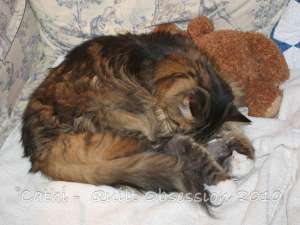 The cats know how to deal with this weather. They curl up and have a snooze. First Smudge was on the couch, curled up with a teddy bear.