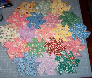 I begin to applique, pulling out a section or two of the basting thread as I go along. The basting thread also serves to hold the fabric being appliqued in place. So no fighting with pins, no freezer paper to remove, no overlay to try to keep out-of-the-way and no lines that might show on the front if the applique isn’t right on the lines of the design. Just needle, thread and fabric.