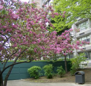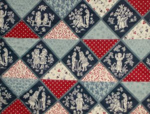 With the applique design printed on the back of my background fabric, I pin a piece of fabric that’s large enough to cover the shape to be appliqued on to the right side of the background, with the right side of the fabric to be appliqued facing up. Then, from the wrong side of the background and following the lines, I baste the pieces on to the background fabric using the large needle and large thread and taking relatively small stitches. Here you can see all the pieces on the quarter block basted down. If you click on the picture to enlarge it, you’ll see the basting stitches quite clearly on the pieces to be appliqued.