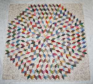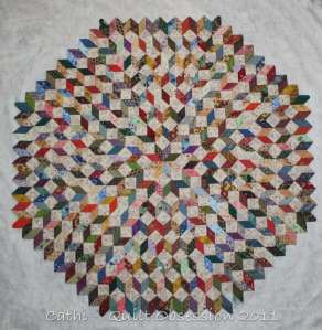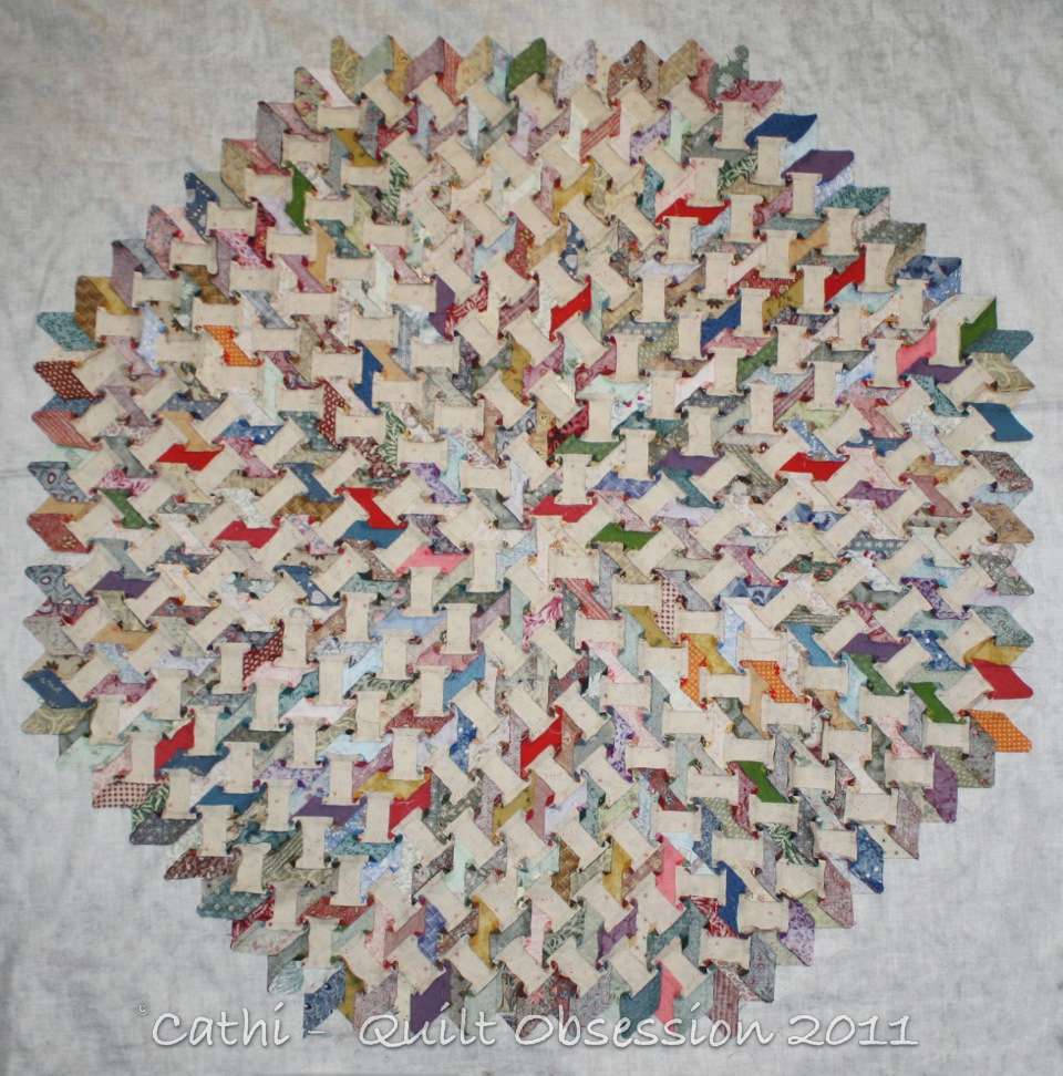 Once I had decided on this idea I looked in the scraps container and, sure enough, I had just enough of the pink/green fabric for the four centre squares. I quickly ironed it to freezer paper, fed it through the printer and had my squares. A minute later and I had printed the 16 triangles needed to turn them into the squares in squares. Half an hour later and they were stitched.